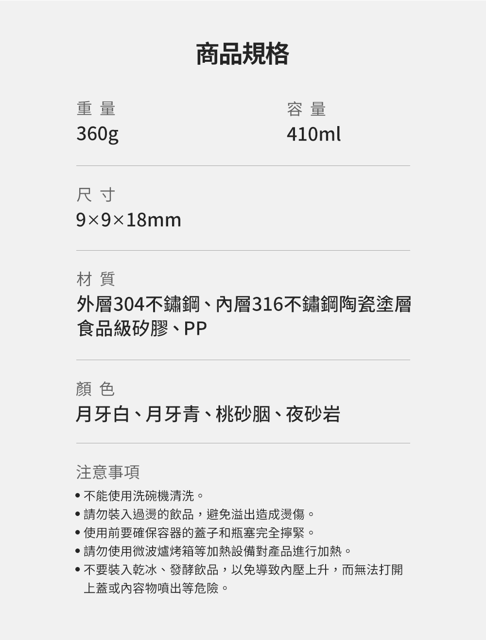 材質:內層316不鏽鋼陶瓷塗層、外層304 不鏽鋼、PP、食品級矽膠