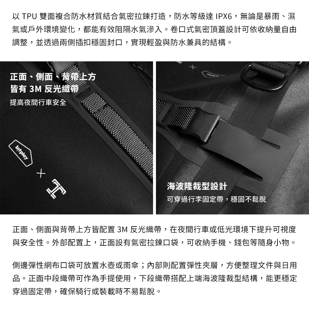 · TPU 雙面複合防水材質搭配氣密拉鍊,防水等級IPX6
