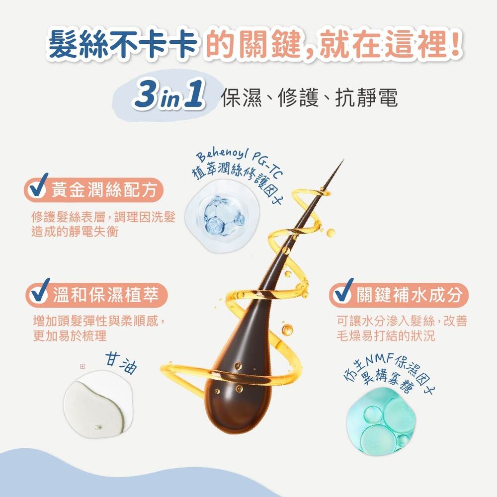 ✔ 溫和植萃潤絲配方,保濕護髮同時維持頭髮彈性。