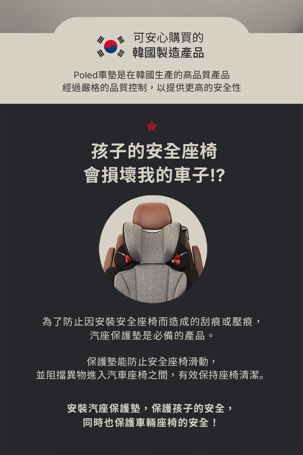韓國Hyundai現代汽車團隊研發|專為兒童安全座椅打造的多功能保護墊,具備防滑固定、防水耐髒與座椅防刮設計,有效延長車椅壽命,同時提升乘坐穩定性與車內整潔度
