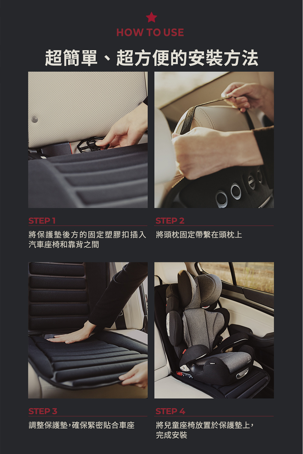 .安裝嬰兒汽車安全座椅於保護墊上時,請確保座椅已緊固牢靠後再使用